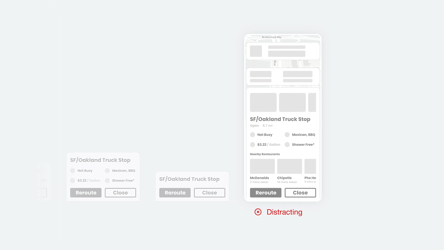 I led a massive sourcing effort to remotely test prototypes during COVID. My team contacted every truck stop in California, 25 online trucking communities and over 50 individual truckers! Below are notable design decisions from usability tests with 9 participants.