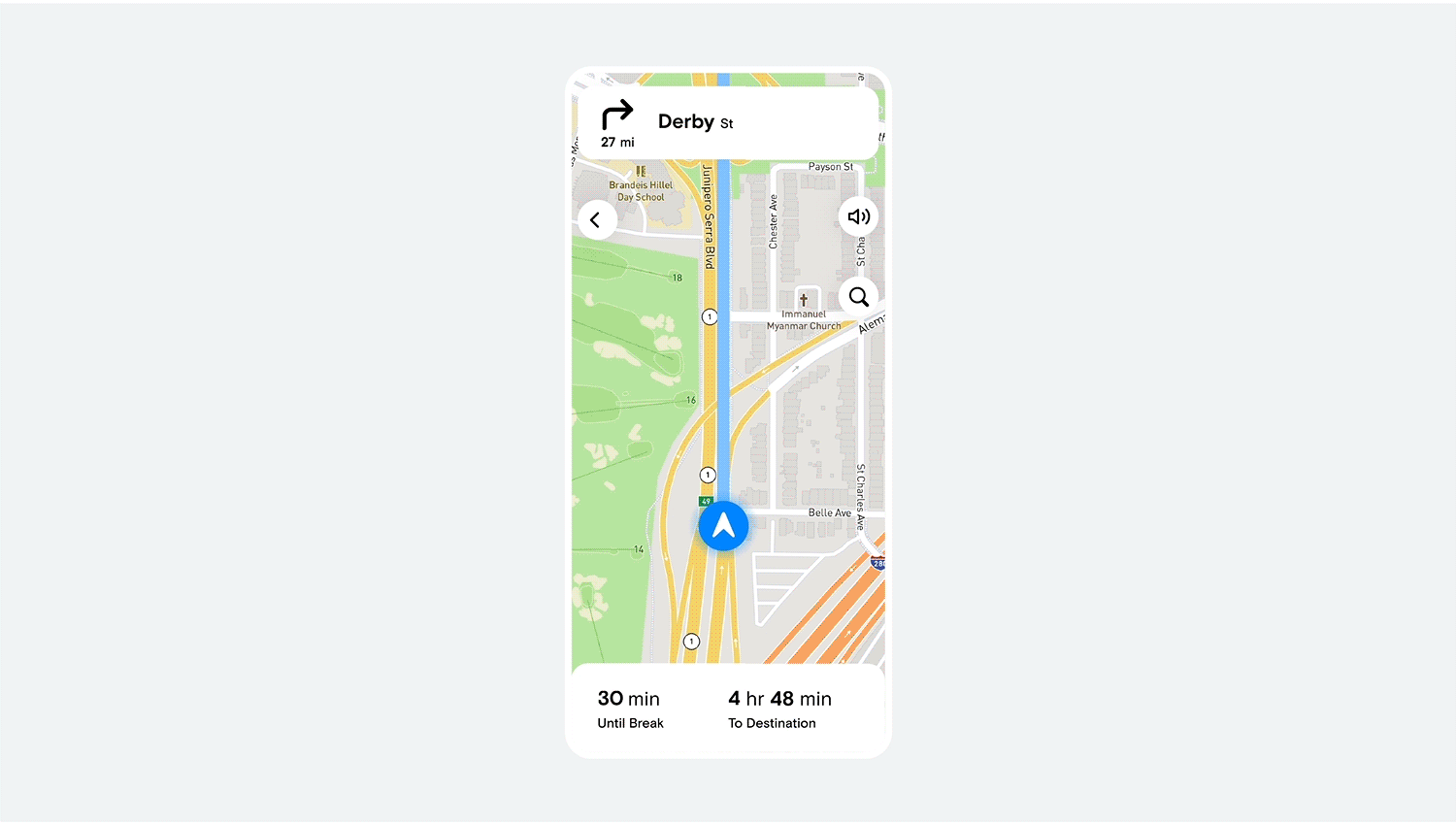 Truckers constantly track four federally mandated break clocks of varying complexity. Avoiding work break violations—which put employment at risk—is like performing mental gymnastics. The default navigation screen always displays time until the nearest break and alerts truckers at 30 minutes left via visual and auditory cues.